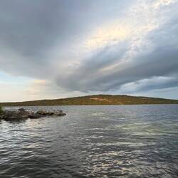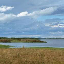 Ooooh Petrus, das ist nicht gut für deine Blase, wenn du es so lange einhältst. Hat der alte Mann doch wirklich die ganze Nacht durch Besuch von seiner alten Freundin Inkontinenzia gehabt. Mehr als 24 Stunden hat es bis auf eine halbe Stunde durchgehend geregnet, in der Nacht sogar noch deutlich stärker. Respekt. Das Geprassel auf dem Zelt hat mich erst spät schlafen lassen und so ist es schon halb neun durch, als ich heute aufwache. Immerhin, es regnet. Einen Moment die Augen gerollt, dann ein Blick raus. Da hinten ist Azur dabei, sehr beruhigend. Tatsächlich hört der Regen während des Frühstücks mehr und mehr auf, ich bin guter Dinge und würde jetzt eh weiterfahren, egal welcher Segen da niederkommt. Nachdem ich alles vorbereitet habe, schaffe ich es ausgerechnet heute unter diesen Umständen, die straffe Haut des Dachstuhls mit einem Mal trockenzuwischen ohne noch einmal dranzumüssen. Jetzt nichts wie einpacken und los geht’s gegen elf bei 13 Grad. Was ich vor mir so rumschweben sehe, ist durchaus für weitere Wolkenbrüche brauchbar, aber die paar hellen blauen Stellen sagen mir, es wird gut. Und tatsächlich schieben sich unglaublich tolle Formationen von tief dunkelgrauen Wolken durch, die aber immer wieder durchschnitten oder zerrissen sind und das Sonnenlicht dazwischen nicht verbergen können, so sehr sie sich auch mühen. Ich merke, das wird ein echter Panoramatag. Würde mir wünschen, einen Schwanenhals zu haben, weil meiner für die unglaubliche Szenerie nicht ausreichend ist oder ich ständig im Kreis fahren würde. Diese Landschaft Richtung Südwesten mit ihren weichen Formen, so unheimlich weit überschaubar, gesäumt von Birkenwald, auf einigen der Höhen ist es auch nur noch am Boden grün, da die Baumgrenze schon überschritten ist. Immer mal wieder Seen oder ein Fluss, der sie miteinander verbindet. Nun ist mir diese Gegend nicht völlig unbekannt, denn in Kautokeino, dem Ziel des heutigen Ausritts, habe ich letztes Jahr am 25. September meine Wanderung beendet, nachdem der Winter mich einige Tage vorher eingeholt hatte. Aber in diesem Licht und aus dieser Richtung habe ich es natürlich nicht gesehen, umso schöner. Gegen halb zwölf sehe ich schon vom weiten auf dem Vuottašjávri ein Wassertaxi stehen, natürlich biege ich pro forma von der Straße ab, um mal zu sehen, ob hier was los ist. Aber rund ums „Mosquito Air Taxi“ ist Totenstille und extra jemanden anrufen will ich nicht. Es rollt sich heute Morgen übrigens unglaublich toll, die Aufs und Abs der Straße nehme ich nicht als schwierig war, sondern fühle mental enormen Rückenwind. Immer wieder bremse ich aber auch schnell runter und steige ab, um ein Foto zu machen. Versuche, diese Wolkengebilde und -gebäude irgendwie festzuhalten, aber wenn schon meine Augen kaum in der Lage dazu sind, wie kann es dann die schnöde Linse dieses kleinen Telefons sein? Je nachdem, in welche Richtung ich blicke, ist es schon heller und blauer, vor mir haben die Wolkenkontraste alles von weiß bis fast schwarz angenommen. In weiterer Entfernung sehe ich schon höhere Erhebungen, schließlich sind in 50-60 Kilometern auch schon die wunderschönen Berge, durch die ich im letzten Herbst Richtung Norden gewandert kam. Das Gebiet hier ist typisches Samiland, recht deutlich an den einzelnen Häusern und Gehöften mit all den ebenso typischen Sachen wie Schneemobilen, Sixwheelern und einer Menge „Hausrat“ außenrum zu erkennen. Aber auch immer mal wieder an den seitlich der Straße gelegenen Rentierpferchen zu sehen, die meistens eine Verladerampe haben. Um kurz nach eins komme ich an und dann auch über den Fluss Kautokeinoelva, es ist inzwischen Zeit, bei gut 18° alles an Klamotten von mir zu werfen, was nicht zwingend benötigt wird.. Nachdem ich ihn überquert habe, endet hier die Inlandsstraße 92, ich biege links südlich auf die Europastraße 45 ab, die gleichzeitig als EuroVelo 7 die Sunroute nach Malta ist. Ein paar Kilometer darauf habe ich ja weiter nördlich schon gefahren, als ich auf dem Weg zum Kap war. Gegen halb drei reizt mich linkerhand die Zufahrt zum Skuvlajávri, ich will gerne bis an diesen See heran fahren. Ein ziemlich sandiger Weg führt von der Straße ab und nachdem ich ein Stück weit gefahren bin, sehe ich von weitem erst einen Hund und etwas später auch das Herrchen dazu. Die beiden allerdings recht weit auseinander, der Hund deutlich näher bei mir. Es ist eine Husky-Hündin, die mit aufgestellten Ohren dort steht, mich schon von weitem anbellt und dann stracks auf mich zukommt. Inzwischen angehalten konzentriere ich mich darauf, was wohl jetzt passiert. Der Hund bleibt immer noch mal stehen, bellt und knurrt. Ich bekomme langsam ein Gefühl dafür, dass er es doch nicht gar so ernst meint. Irgendwann schleicht er in den seitlichen Büschen eher um mich herum und als sein Herrchen dann in meiner Nähe ist, gibt der mir zu verstehen, dass sie eine sehr liebe ist, er aber trotzdem versteht, dass ich jetzt unsicher war. Der kleine Ausflug lohnt sich am Ende nicht wirklich, da dieser Weg gar nicht bis an den See rangeht und so habe ich diesen Kilometer hin und zurück für Volk und Vaterland gefahren. Gegen halb vier erkenne ich schon aus einiger Entfernung ein paar Häuser von Kautokeino, unter anderem die Kirche. Direkt am Ortseingang neben einem Schnellimbiss sitze ich noch mal kurz auf einer Bank, unterhalte mich mit ein paar Leuten hier aus dem Ort und bin dann gegen vier tatsächlich am Ziel. Die 3 km durch das kleine Städtchen geht es nur bergab und schon spreche ich bei Ole, dem Betreiber des Duottar(Tundra)-Camping vor, checke für diese Reise mit dem Zelt ein. Ein kurzes Schwätzchen zum Auffrischen unserer letztjährigen Bekanntschaft, ein kleiner Einkauf im nahen Supermarkt und noch das Zelt aufgebaut, schon bin ich fertig für die Sauna um 18 Uhr. Darauf habe ich mich den ganzen Tag gefreut und genieße diese halbe Stunde in vollen Zügen. Anschließend schwimme ich n