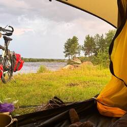 Wieder hat es in der Nacht geregnet, also immer dann, wenn es mich so gar nicht stört. Recht früh am Morgen, es könnte wohl gegen sieben rum sein, höre ich Schritte draußen. In der Hoffnung auf einen kapitalen Elch blinzle ich durchs Turmluk und gebe mich mit einem vorbeiziehenden Ren zufrieden. Es ist noch leicht am Regnen, während mein Blick mir mindestens zur Hälfte am Firmament schon blauen Himmel verrät. Das lässt sich doch gut an, also raus aus dem Federwerk und ran ans schwarze Gold zur Morgenstunde. Hoffentlich hält der kräftige Wind noch ein wenig an, so habe ich gute Chancen, ohne die Knots klarzukommen, die sonst schon ziemlich penetrant sind. Die Mücken dagegen sind im gut überschaubaren Rahmen. Noch während ich frühstücke, hört es auf zu regnen, die Sonne kommt raus und so habe ich ein leichtes Spiel, am Ende kurz drüberzuwischen und bin fertig. Der Berg Pyhäkero, der sich weit dahinten über dem See bis auf 713 moh erhebt, liegt in leichtem Dunst, es ist ein wunderschöner heller Morgen. Als ich das Rad auf dem sandigen Weg zum Aufsteigen bereit mache, fällt mein Blick unweigerlich auf den Tacho und ich bin erschrocken, wie früh es doch ist. Noch’ne Stunde abgezogen, ist es jetzt wirklich erst Dreiviertel sieben? Halt, diese Uhr ist ja nicht finnisch, also ist es in Wirklichkeit Dreiviertel acht, eigentlich wache ich um diese Zeit so oft erst auf, aber heute radel ich los. Folge für die nächsten 25 km noch der Sunroute, ich würde sie aber eher als die GirlsRoute bezeichnen. Es sind unheimlich viele Frauen unterwegs, oder fallen mir die einfach mehr auf als die Kerle? Ein Schelm, wer Böses dabei denkt. So auch ein junges hübsches Mädel mit langem geflochtenen Zopf, das mir in der Morgensonne entgegengeradelt kommt und mit ihr um die Wette strahlt. An einer kleinen Ausfahrt rechts der Straße, hier ist sowas wie Café und Parkplatz ausgeschildert, treffe ich auf eher verlassen wirkende Gebäude, die irgendwie nach Veranstaltungen im Winter aussehen. Mein Ziel war eigentlich, einen Mülleimer zu finden, stattdessen steht dort aber ein großes Siegertreppchen, auf das ich mich heute früh doch einfach selbst hochschwinge und eine kleine Pause halte. Warum denn nicht? Gratuliere mir gleich noch zum schönsten Freitag in dieser Woche. Auf dem weiteren Weg überholt mich etwas später ein französisches Paar. Wir werden uns noch einmal eine gute halbe Stunde später begegnen und ein wenig quatschen, als ich am Straßenrand stehe und einer Libelle erste Hilfe leiste, die gerade eben von einem Auto getroffen wurde. Ob sie es schafft, bleibt am Ende ungewiss. Die zwei halten aber an, weil sie eher ein Problem bei mir vermuten. Verständlich, guck mich doch mal an! Und so haben wir etwas Zeit, uns ein wenig über das Von und Nach auszutauschen. Sie werden in Kürze in Palojoensuu auf die E8 Richtung Süden nach Helsinki abbiegen, während ich gegen halb elf an dieser Stelle rechts nach Nordwesten abdrehe. Der blaue Himmel ist bis dahin in recht kurzer Zeit doch einer dunklen Wolkenwand gewichen, die sich freundlicherweise mit meinem Richtungswechsel auch aus meinem Sichtfeld entfernt. Für mich bleibt es schließlich der EV7, der sich jetzt am Muoniojoki entlang zieht, welcher hier die Grenze zu Schweden darstellt. Ich gebe heute wieder den ganzen Tag den Grüßaugust, insbesondere bei Motorradfahrern, die ja üblicherweise nur ihresgleichen Gruß erwidern. Vielleicht sind die Leute von dem Mann inspiriert, der oben ohne reist statt in Jacken, Mützen und Handschuhen eingehüllt zu sein, wie ich auch so manchen Radler hier sehe. Die müssen doch kaputt gehen da drin! Irgendwann Richtung halb zwölf sind am Straßenrand immer mal wieder kleine selbstgemachte Schilder aufgestellt, die vermutlich auf irgendwas essbares, vielleicht einen Imbiss hindeuten. Aus dem finnischen kann man sich wirklich nix, aber auch gar nix ableiten, wie es in der schwedischen oder norwegischen Sprache so simpel möglich ist. Also kehre ich gegen elf an diesem Parkplatz ein, es riecht schon von draußen gut und in der großen runden hölzernen Hütte verkaufen sie geräucherten Lachs, Seesaibling und diverse andere Leckereien, die einen auf langen Reisen auf den Geschmack und wieder zu Kräften bringen. Ich nehme mir ein Stück geräucherten Lachs, der mit Blauschimmel gefüllt ist. Was für eine Leckerei und dabei ist es noch nicht mal richtig Mittagszeit. Mit der Betreiberin unterhalte ich mich recht lange, es ist so interessant, wenn die Leute von hier aus diesem Leben erzählen, von dem ich gar nicht so weit entfernt im letzten Winter ja schon so einiges mitbekommen habe. Lannavaara ist von hier nur noch 50 km Luftlinie entfernt, entlang der Straßen aber ist es für mich heute nicht mehr erreichbar. Nach dieser Köstlichkeit fröne ich weiter durch die arktische Tundra bei 23°. Ein Knacken oder besser gesagt Klicken, was ich seit drei oder vier Tagen bei jeder Umdrehung der Pedale höre, konnte ich bisher nicht genau ausmachen, werde es aber auch vorerst ignorieren. Es hört sich nicht akut an und ist ein wenig wie ein Taktgeber. Sumpf, Wald, weites Land mit sanften Hügeln, wunderbar koloriert und gut beleuchtet, das ist mein Weg. Je länger sich der Nachmittag hinzieht, desto dunkler zieht sich das Gebräu am Himmel zusammen und der Wind frischt auf. Noch bevor irgendwas himmlisches losgeht, erreiche ich Karesuando und wechsle auf die schwedische Seite, wo ich seit ach wie langer Zeit tatsächlich mal eine unverschlossene und für meine Begriffe auch wirklich schöne Kirche vorfinde. Ich genehmige mir ein halbes Stündchen und sehe noch zu, dass ich in der Nähe des Muoniojoki niederkomme. Es windet heftig, auffällig viele Schwalben fliegen hier, als würden sie sich schon sammeln. Der schwere Regen, den ich angesichts der dunklen Wolken erwartet habe, bleibt aus. Also alle Dramaturgie nur für mich zur Faszination inszeniert.Read more