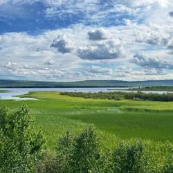Aufgewacht, die Sonne lacht. Es ist gegen acht und ich schäle mich langsam aus dem Bett. Zu meinem Erstaunen hat Ivar mir ganz liebevoll ein delikates Frühstück mit Marmelade und Käse angerichtet, während er jetzt gerade raus in den Stall verschwindet und die Kühe milkt. Eine gute Stunde braucht er ohnehin, die ich Zeit habe, all das hier zu genießen und in einem Magazin einen Bericht über ihn zu lesen, der seine recht einzigartige Käserei und den Hof hier so weit im Nordosten beschreibt. Gegen neun trete ich draußen an, schließlich habe ich ja meine Hilfe versprochen. Bevor es losgeht, kann ich mich noch eine Zeit lang mit der Auswanderin Janine unterhalten, sie ist schwer dabei, Käse zu portionieren und vakuumieren, damit nachher auf dem Marktstand in Kirkenes auch ausreichend zum Verkauf verfügbar ist. Die Sonne steht blendend am Himmel und als Ivar mit dem Melken fertig ist, drückt er mir schon mal den dicken Wasserschlauch in die Hand, so dass ich im Stall den Boden an einigen Stellen reinigen kann. Derweil merke ich recht schnell, wie ich hier vom Wander- zum Stallburschen werde, der ich irgendwie ja auch schon als Kind und Jugendlicher zu Hause auf unserem Hof war. Wir schaffen gemeinsam ein paar Kälber von einer Box in die andere, zu zweit ist das ruckfix in 2 Minuten erledigt. Als später eins aus dem Stall entwischt und draußen auf dem Hof rumläuft, ist auch dies zu zweit sehr schnell wieder eingefangen und zurück am rechten Platz. Ich merke, unter welchem Zeitdruck er steht, da will die Tierärztin noch vorbeikommen, es gibt noch einige Kühe auf eine andere Weide zu bringen und natürlich muss er irgendwann aufbrechen nach Kirkenes zum Stadtfest. Gestern am Abend hatte er schon erwähnt, dass heute der erste Tag wäre, an dem er pünktlich da ist. Es wird wohl eher bei der Theorie bleiben. Der Kuh mit dem Kälbchen draußen auf der Wiese Kraftfutter und Wasser bringen, dann noch Heu vom Boden runter für alle im Stall verteilen, Strom am Elektrozaun aus- und wieder einschalten, mir ist das alles tatsächlich nicht sehr fremd, auch wenn ich natürlich die Abläufe hier auf diesem Hof bis dahin nicht im Detail kenne. Umso angenehmer ist es, mit ihm zu arbeiten. Denn trotz eines gewissen Stresses lacht er immer wieder und ist in seiner guten Laune nicht zu verbiegen. Gegen elf verlassen die zwei das Gehöft, wir verabschieden uns und ich kann noch schnell eine Dusche nehmen, schließlich ist hier in dieser Gegend eh Tür und Tor geöffnet, niemand muss ich um so etwas kümmern. Das erinnert mich sehr an meine Kindheit in der DDR. Um halb zwölf starte auch ich durch. Es zieht sich wieder auf dieser ewig langen Straße, die die besten Zeiten hinter sich hat und mit ihren vielen kurzen Wellen ein ziemlich rappeliges Fahren verursacht, insbesondere durch die Querrillen, die sich immer wieder ein paar Zentimeter breit über die gesamte Straße ziehen. Sie machen mir manchmal das Gefühl, als würde ich im Waggon der Deutschen Reichsbahn sitzen, wo es ziemlich ähnlich ewig dieses Dadatt, Dadatt…….Dadatt, Dadatt gemacht hat. Auf dieser Straße ist glücklicherweise so wenig Verkehr, dass ich sie immer auf voller Breite nutzen kann, also zumindest versuche, den ärgsten Widersachern auszuweichen. Zu sehen gibt es leider nicht sehr viel mehr als immer wieder die lange, lange Straße, die sich durch den Mischwald zieht. Wie oft kann ich 2-3 km im Voraus die Strecke erkennen, nur manchmal zieht es sich dichter an den Fluss heran oder an einem der vielen kleinen Seen vorbei. Immer mal wieder zwischendurch sehe ich Kühe auf der Weide und dazu kleine Farmen, gerade dann geht mir das Wort Paradiesvogel durch den Kopf. Aber Paradieskühe, von denen habe ich noch nie gehört, hier wäre der Titel wirklich passend. Ivar hatte mir erzählt, es hat früher hier im Pasvikdalen bis zu neunzig solcher Kleinbauern gegeben, wie er heute einer ist. Der übrigens 23-jährig den Hof der Eltern übernommen und erst vor einigen Jahren mit der Käseproduktion begonnen hat. Den Großteil der Milch holt der hier in Norwegen größte Molkereibetrieb Tine regelmäßig ab, damit auch im Supermarkt in der Meieri für alle ausreichend im Angebot ist. Gegen halb eins komme ich an einem der sechs Staudämme am Pasvikelva vorbei, an dem in einem doch recht großen Wasserkraftwerk Strom erzeugt wird. Ein norwegisches Paar versucht sich hier am Anglerglück, ich unterhalte mich mit der Frau eine ganze Weile, die hier aufgewachsen und jetzt gerade zu Besuch ist, während weiter draußen auf der riesigen Wasserfläche die Militärs in Schnellbooten patrouillieren. Der Fluss hat übrigens meistens eine Ausdehnung, die ihn wie einen großen See erscheinen lässt. Angesichts der Temperaturen habe ich mein Shirt schon lange ausgezogen, brauche es nur bei Pausen zwischendurch, wenn Fliegen und Mücken mir zu sehr auf die Pelle rücken. Gegen zwei zieht sich die Straße für eine längere Zeit mal in der Nähe des Flusses entlang, von hier aus habe ich wunderbare Aussichten rüber in die russischen Berge und Wälder. Die Landschaft hier ist eine völlig andere, als sie noch in Kirkenes war, es ist eher sumpfig flaches Land, wie ich es auch zeitweise beim Wandern im letzten Jahr erlebt habe. So gegen vier erweckt ein Hinweisschild mit einer Kaffeetasse darauf mein Interesse, ich biege von der Straße ab auf einen ziemlich kleinen Campingplatz. Auf dem ich mir aber gar nicht sicher bin, ob ihm dieses Schild galt. Denn Kaffee gibt es hier weit und breit nicht, stattdessen treffe ich aber die nette Schweizerin Salomé, die mich vorhin zusammen mit ihrem Mann Konrad im Wohnmobil überholt hat. Sie bieten mir einen Kaffee und ein Stück Kuchen an, ich sitze eine gute Stunde bei ihnen, wir unterhalten uns über unsere Reisen. Insbesondere wachsen meine Ohren auf Salatblattgröße an, als sie davon erzählen, dass sie erst kürzlich in Kaliningrad für eine Zeit zu Besuch waren, also ganz normal ein Visum bestel