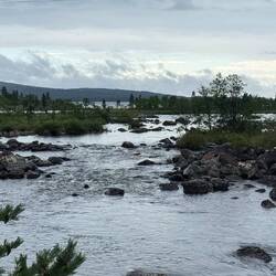 Freitag, der 1. August. Den Weckdienst übernimmt gegen halb acht die Sonne und da mir heute Morgen irgendwie nicht nach Frühstück ist, packe ich einfach zusammen, während ein neugieriges Rentier aus gut 150 m Entfernung extra durch den Fluss rüber zu mir geschwommen kommt, um dann doch in gebührendem Abstand weiterzuziehen. Ich wasche an dem Fluss, der hier in den Langfjord fließt, noch mein Handtuch aus und sehe dabei wie schon etliche Male eine dieser Fischschleusen. Thomas hatte mir schon erzählt, dass sie teils mit Hightech ausgerüstet die Fische vollautomatisch selektieren und passieren lassen, diese hier sieht mir noch recht einfach aus und wird wahrscheinlich eher manuell bedient. Alle zwei Jahre, wenn die Lachse die Flüsse hochziehen und dann sterben, hinterlassen sie natürlich im Wasser Unmengen von Rückständen ihrer Verrottung. Das hat, wie ich erfahre, in den letzten Jahren so massiv zugenommen, dass man die Flüsse mehr oder weniger ganz gegen den Lachszug sperrt, um das Ökosystem nicht zu gefährden. Zurück in Sandnes an der Hauptstraße hole ich mir im Supermarkt noch schnell ein Brot und fahre gegen halb zehn dort ab. Nur 2 km weiter biege ich links nach Björnvatnet ab, hier möchte ich Ernst Leif Sneve besuchen, ein Mann, der hier aufgewachsen ist und als Kind den Krieg miterlebt hat. Seit einigen Jahren ist er als Guide tätig und engagiert sich, Fremden die Geschichte hier näherzubringen. Da ich keinerlei Kontaktdaten habe, fahre ich aufs Geratewohl hin, stehe aber leider vor verschlossener Tür. Das hatte ich allerdings auch wohlwollend mit einkalkuliert. Auf dem Weg raus aus dem Dorf treffe ich einen anderen Bewohner, als ich gerade mein Fahrrad in der wohl sichersten Bushaltestelle der Welt abstelle. Es ist ein riesengroßer Baggerlöffel von einem Minenbagger. Wir unterhalten halten uns ein wenig und auch von ihm bekomme ich deutlich seine Abneigung gegenüber den russischen Nachbarn zu spüren. Zurück auf der Hauptstraße zieht es sich am Rand des Minengebietes entlang, hier ist eine kilometerlange Steinhalde aufgeschüttet, die nicht benötigten Überreste der Erzgewinnung. Nach einem weiteren Kilometer an einem Haus, wo ein junger Mann gerade am Rasenmäher repariert, stoppe ich, da mein Sattel seit Ewigkeiten quietscht, frage ich ihn nach Kriechöl und bei der Gelegenheit auch gleich nach dem Flugzeug, von dem mir die Frage nach den verbliebenen Teilen wie Flügeln, Cockpit und dergleichen nicht aus dem Kopf geht. Und siehe da, man muss nur den richtigen fragen, dann gibt’s auch Antworten. Da die Deutschen auf ihrem Rückzug alles niedergebrannt haben, was nur irgendwie möglich war, haben die Bewohner sich aus den zurückgelassenen Sachen der Besatzer und natürlich auch aus den abgestürzten Flugzeugen alles geholt, was in irgendeiner Form in den ersten Jahren für notdürftige Behausungen und dergleichen verwenden konnten. Souvenirjäger haben über Jahrzehnte ebenso mitgeholfen, die vorhandenen Überreste Stück für Stück zu dezimieren. Das ergibt Sinn und das Nagen in meinem Oberstübchen ist erstmal etwas gebremst. Die Straße zieht sich elegant sanft auf und ab, erst am Langfjorden entlang, der kurz darauf vom See Langevattnet das Süßwasser aus dem ganzen Tal zugespielt bekommt. Es gibt in diesem Tal etliche Kraftwerke auf russischer, finnischer als auch norwegischer Seite und durch diese Aufstauungen ist aus dem Fluss sowas wie ein langer See geworden. Die Karte verrät mir, dass es rundherum überall unzählig viele kleine Seen gibt, es fühlt sich recht finnisch an. Es ist circa halb zwölf und ich sitze weit oberhalb des Fjords auf einem kleinen Rastplatz in der Sonne, schreibe mein Tagebuch und genieße die Aussicht. Da gesellt sich ein älteres norwegisches Paar zu mir an den Tisch, das gerade mit dem Wohnmobil gehalten hat. Sie laden mich zu Kaffee und Kuchen ein und als kleines Entgegenkommen bemühe ich meine spärlichen Schwedisch-Kenntnisse, da sie mit Englisch nicht helfen können. Und siehe da, wenn es denn nur erforderlich ist, kommt da doch das eine oder andere zusammen. Ich habe fast 2 Stunden jetzt hier gesessen und mache mich beschwingt weiter auf den Weg durch diese angenehm zu fahrende Landschaft. Gegen zwei weist ein Schild rechts ab der Straße auf ein Museum in gut 4 km im Örtchen Strand hin. Nichts leichter als das, hier treffe ich auf einen Ableger des Museums, dass ich schon in Kirkenes besucht habe. Ein junger Schüler macht die Kasse, ich bin laut dem Gästebucheintrag der erste und wahrscheinlich auch einzige Gast heute. Dementsprechend können wir uns etwas unterhalten und ich sehe mir in Ruhe die Ausstellung an, während ich ein Schokoeis vernasche. Es wird hier hauptsächlich der Schulalltag in den alten Zeiten präsentiert und wie in fast allen anderen Museen auch der Alltag der Menschen im Allgemeinen. Wieder zurück auf dem Weg komme ich an den letzten richtigen Ort, ich definiere das meistens an einem vorhandenen Supermarkt. Hier ins Svanvik ist der letzte, den ich zwar nicht aufsuche, dafür aber das Nationalparkzentrum Svanhovd, das über die lokale Umgebung und natürlich den Pasvikdalen-Nationalpark informiert. Eine junge Österreicherin am Empfang erklärt mir, dass das Kassensystem aufgrund eines außergewöhnlich heftigen Gewitters in der Nacht ausgefallen ist und dementsprechend der Eintritt frei ist. Gewitter? Letzte Nacht? Da war doch was… Ich beschwere mich nicht drüber und durchforste auch diese Ausstellung, während sie mich teilweise dabei begleitet und wir uns unterhalten. Da das Haus auch gleichzeitig ein Hotel mit Restaurant ist und sie für einen überschaubaren Preis ein Buffet anbieten, nehme ich das Angebot gegen fünf wahr, um mich ganz im Sinne meiner Frau Mutter mal wirklich lang und breit satt zu essen und die Niederschrift des Erlebten voranzutreiben. Ich glaube, kein Gast hat jemals so lange hier zum Buffet gesessen und so viel gegessen. Lecker Kotelett mit Rosmarin