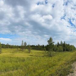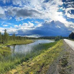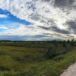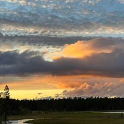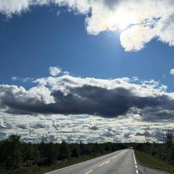 Ich liege ja hier unweit der Straße, bin nur gute 20 m von der E45 entfernt, da lässt jeder LKW den Boden bei der Durchfahrt leicht beben. Der Mensch gewöhnt sich an alles und da es insbesondere in den Nachtstunden deutlich weniger Verkehr gibt, ruhe ich doch ganz friedlich. Es dürfte ungefähr fünf in der Früh sein, da zerreißt einer dieser schweren Vielachser jäh das dünne Gewand meines Schlafs. Ich sage dem frühen Vogel, er soll sich seine Federn doch an den Hut stecken und drehe mich wieder um. Aber der tiefe Schlaf ist durch, leichter Regen auf dem dünnen Gewand meines Schlafsaals lässt ein wirklich tiefes Schlummern nicht mehr zu. Also kann ich dann auch um halb acht aufstehen und ausgiebig die Küche im Gemeinschaftsgebäude nutzen, um mir heute mal Brötchen aufzubacken und die mit Erdnussbutter zu genießen. Während einer Dusche und eines Schwätzchens am Wegesrand ist mit der Sonne und dem Wind auch alles schon wieder abgetrocknet, so dass ich packen kann. Beim Verabschieden lerne ich noch Nastassja kennen, eine junge Deutsche, die auch in irgendeiner Art ausgetreten ist, jetzt im Sommer hier bei Ole hilft und mich vielleicht auf dem Weltwegweiser hier auf dem Campingplatz verewigen will. Und schon bin ich für meine Verhältnisse recht früh um zehn auf der Straße Richtung Süden. Wie ich Kautokeino verlasse, ist es wie ein Dejavu: Vor fast einem Jahr habe ich an dieser Straße gestanden und eine gute halbe Stunde meinen rechten Daumen bemüht, um innerhalb kürzester Zeit von einem Jäger aus Oslo fast bis nach Kiruna mitgenommen zu werden. Heute rolle ich selbst hier entlang, fühle mich dabei aber relativ schwach. Ob das wohl an mir liegt? Die äußeren Umstände können es eigentlich nicht sein, denn die Sonne scheint durch die Wolken hindurch. Zwar eine andere Art von Wolken, aber sie lacht. Es ist mehr eine flache, fast zusammenhängende Decke, die aber trotzdem höchst interessante Farben und ganz weit in der Entfernung irgendwie orange beinhaltet. Ich kurbele so langsam vor mich hin und akzeptiere, dass die circa 80 km bis nach Enontekiö dann heute wohl doch etwas länger brauchen. Dank der grandiosen Wolkenspiele wird es mir aber mit Sicherheit nicht langweilig werden dabei. Gute anderthalb Stunden später, ich habe vielleicht 20 km gemacht, fällt es mir wie Schuppen aus den Haaren! Ich habe einiges an Vorräten im Kühlschrank vergessen. Wäre es nur die Dose Bier gewesen, hätte ich darauf verzichtet, aber dieser spezielle Schinken, von dem ich gestern auch gleich zwei Packungen gekauft habe und den ich auf dem weiteren Weg definitiv nicht mehr bekomme, der muss mit. Da beißt die Maus kein’ Faden ab! Jetzt mag ich aber nicht anderthalb Stunden wieder zurück und dann noch mal anderthalb Stunden zurück zurück bis hierher fahren, also parke ich den Hobel kurzerhand einige Meter von der Straße entfernt und versuche mich mal wieder in Hitchhiking. Naja, so viel Verkehr ist auf dieser Straße dann doch nicht, wenn ich es jetzt hier aus dieser Sicht so betrachte. Eine gute halbe Stunde braucht es schon, bis ein Auto hält und eine Frau aus der Umgebung mich das Stück mit zurücknimmt. Ole ist schon kräftig am Aufräumen und hat den Kühlschrank inzwischen geräumt, holt mir aber flott die Sachen her und im Handumdrehen habe ich ein zweites, aber noch deutlich kräftigeres Dejavu. Jetzt stehe ich wirklich wieder hier am Straßenrand und versuche, Richtung Süden zu kommen. Es dauert heute ein ganzes Stück länger, bis mich ein Holländer in seinem kleinen und ziemlich schwachbrüstigen Auto mitnimmt. Er erzählt mir, während er selbst bei minimalen Hügeln ständig rechtshändig am Rühren ist, dass er diese Schlurre vor kurzem für‘n Tausender gekauft hat, um damit zum Nordkap zu fahren, von wo er jetzt gerade zurückkommt. Scheint also zu funktionieren, mein Schaden soll’s nicht sein und so bin ich gegen eins wieder mit den Futtervorräten an meinem Fahrzeug. Den geretteten Salat reiße ich mir gleich erst mal auf und fühle mich insgesamt nach dieser, nennen wir es Pause, doch kräftiger als zuvor. Damit ich aber vor lauter Kraft nicht außer Kontrolle gerate, steht mir der Wind jetzt ins Gesicht. Es zieht sich heute flacher, durch unendlich weite Ebenen und große Sumpfgebiete, in denen der Wind immer wieder diesen besonderen für mich bis heute undefinierbaren Duft mitbringt. Die Landschaft ist durchsetzt mit unzähligen kleinen Seen, Verbindungskanälen und Flussarmen, die kaum einzeln konkret zu definieren sind. Wenn ich manchmal für ein Foto ein Stück weit in diese Landschaft hineingehe, ist das nie ohne nasse Füße möglich. Dank der Crocs macht das aber sogar Spaß, ein wenig durch diesen nassen Untergrund zu stapfen. Hier auf der Sunroute sind im Vergleich zu den letzten Tagen recht viele Fernradler unterwegs, es ist immer wieder eine Freude, sich gegenseitig mit einer gewissen Überschwänglichkeit zu grüßen. Auf einem heimischen Radweg ist das ja ob der Menge an Leuten eher nicht so geläufig. Grüßen tun aber auch viele Wohnmobillisten, nicht nur heute sehe ich schon von weitem die Lichthupe oder näher ihre Gesten. Sie nehmen mir mit ihrem Winken gefühlt den einen oder anderen Meter ab. Am Palojärvi, das ist einer dieser vielen unscheinbaren Punkte entlang der Straße, gibt es ein Restaurant mit Kaffee und kleinem Laden. Bei dieser schwülen Wärme draußen lasse ich mir einen Kaffee und ein Lakritzeis gefallen. Während ich hier das WLAN nutzen kann, um meine Bilder unabhängig vom limitierten Datenvolumen zu synchronisieren, erzählen sie mir, das es 20 km weiter in meiner Richtung gerade heftig schüttet. Da lob ich mir doch meine morgendliche Vergesslichkeit und dass ich um genau diese Zeit versetzt jetzt erst hier bin statt schon inmitten der Schlechtwetterfront. Gegen sieben habe ich dann auch als Tagesziel dieses Dorf mit Flughafen am See Ounasjärvi erreicht. Die Straßen sind noch nass und ich schlage etwas unsc