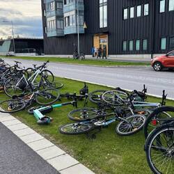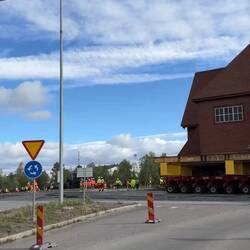 Dies ist der letzte Tag meiner Tour. Heute geht es noch einmal nach Kiruna, das sich von mir und ich von ihm mit diesem besonderen Ereignis des seit Jahren vorbereiteten Kirchenumzugs verabschiedet. Bei bestem sonnigen, aber ziemlich windigen Wetter fahren wir gegen zehn noch dichter an die Stadt heran, ich kenne an der alten geschlossenen Mine einen Punkt, von dem aus wir mit den Fahrrädern gegen halb zwölf in die Stadt reinfahren. Die Hauptstraße in die neue Stadt hinein ist erwartungsgemäß gesperrt und die Menge an Fahrzeugen und Wohnmobilen, die sich hier rumquält, lässt erahnen, wie groß das Interesse an diesem weltweit einzigartigen Ereignis ist. Auf dem Stadshustorget (Vorplatz am Stadthaus) ist eine große Bühne aufgebaut, in diesen Tagen sind viele Veranstaltungen und Konzerte, Kiruna bietet insgesamt ein sehr reichhaltiges kulturelles Programm das ganze Jahr über. Unser Ziel soll als nächstes die Altstadt sein, konkret der Platz, an dem die Kirche bis vor wenigen Stunden gestanden hat. Je nach Zeit und Umständen wollen wir noch den einen oder anderen Ort besuchen, den ich aus dem Winter schon kenne. Massen an Leuten sind zu Fuß oder mit Fahrrädern unterwegs, Auto- und Busverkehr sind ziemlich stockig, die Stadt insgesamt ist aber keineswegs gesperrt oder abgeriegelt. Habe ich mich am Morgen noch gefragt, welchem der vielen mir bekannten Gesichter ich denn wohl heute begegnen werde, macht schon gleich nach der Neustadt das von Ilnur den Anfang. Ein Tatar, der nicht in seine Heimat nach Russland zurück kann und hier im Museum arbeitet. Wir werden uns nach einer kurzen Begrüßung später noch mal wiedersehen und ziehen jetzt erst mal weiter. Dann kommen wir schon vorbei an dem großen neu geschaffenen Platz, an dem morgen am Nachmittag die Kirche ankommen soll. Breite geteerte oder aufgeschüttete Flächen sind geschaffen worden, um den riesigen Tieflader bis hierher zu lotsen. Auf dem Weg durch die alte Stadt müssen wir ein kurzes Stück die Räder schieben und wer sitzt da ganz vorn links als Chauffeur im Stadtbus und kommt genauso wenig voran wie alle anderen Fahrzeuge? Es ist Charlie, der mir über den Winter ein guter Freund geworden ist und der sich im Frühjahr von hier Richtung Norwegen verabschiedet hatte. Wir haben nur eine halbe Minute Zeit, uns über die Straße kurz auszutauschen, er ist von mir hier genauso überrascht wie ich von ihm. Um zwölf haben wir dann den Platz erreicht, der jetzt groß wie leer gähnt und an dem lediglich noch der Glockenturm bis nächste Woche daran erinnert, dass hier bis vorhin auf 40×40 m das 670 Tonnen schwere hölzerne Gotteshaus stand. Dem Umzug von hier aus zu folgen ist natürlich nicht schwer, die teils extra verbreiterte oder gebaute Straße ist leer, wir kommen an einigen Punkten vorbei, an denen ich letztes Jahr ein- oder mehrmals übernachtet habe. Einige der schönen großen, alten schwedischen Häuser stehen noch hier in dem Gebiet, wo alles andere schon Stück für Stück abgerissen wurde. Es lässt vermuten, dass sie wie schon viele andere auch noch angehoben und in die neue Stadt umgesetzt werden. Gut 20 Minuten später haben wir den rollenden Tempel erreicht, es geht gerade relativ steil bergab und ist für uns völlig überwältigend, das zu sehen. Durch die langsame Fortbewegung wirkt es so, als würde die Kirche einfach an einem falschen Platz rumstehen. Ein immenser Tross Schaulustiger ebenso wie an technischem und Begleitpersonal sowie Sicherheitskräften begleitet den Schwertransporter, der auf zwei mal achtundzwanzig Achsen eine große Stahlträgerkonstruktion und darauf das Gebäude trägt. Fenster, Heiligenbilder, Altar und sämtliche Inneneinrichtung sind trotz anfänglicher Überlegungen nicht entfernt worden, sondern werden original mitgeführt. Das ist wirklich imposant anzusehen. Wie sie langsam, aber stetig auf ihren neuen Platz zu- und um einen Teil der Stadt rumsteuert. Nach einiger Beobachtung setzen wir unseren Weg durch die Altstadt fort und kommen Richtung Supermarkt, wo wir uns einiges zum Essen zusammenkaufen und lang und breit Vesper halten. Auf dem Weg begegnen uns Linda und Markus aus Lannavaara, sie haben wir vor Wochen zuletzt schon mal in Norwegen am Fjord getroffen. Ich sag nur Welt, Dorf, Scheibe… Aus dem Laden wieder raus ist der Transport gegen halb drei direkt neben uns und kurz davor, einen Kreisverkehr zu durchqueren. Da stellen wir uns direkt vorn an und haben einen wirklich guten Platz. Noch im laufenden Betrieb werden große Stahlplatten von zwei Radladern verlegt und erst kurz vor der tatsächlichen Passage wird der Verkehr vorübergehend umgeleitet. Diese Organisation ist wirklich sehenswert, keine Hektik, kein Gehupe, jeder hat seine Aufgabe in dieser einmaligen Aktion. Viele Mitarbeiter, die normalerweise irgendwas untechnisches bei der Minengesellschaft LKAB arbeiten, sind in grellen Anzügen zum Absperren und Ordnen dabei. Und dann zieht sie direkt vor uns vorbei, Zentimeter für Zentimeter auf zweihundertvierundzwanzig Rädern. Ich bin sooo happy, dass ich meine Nord-Tour genau hier und heute nach gut zweieinhalbtausend Kilometern beenden kann. Alles hat sich so toll gefügt und verdammt gut funktioniert. Keine Stürze, keine Pannen, alles wie in einem aufwendig kolorierten Bilderbuch. Gut, aber noch bin ich ja hier. Das falunrote 1912 eröffnete Fachwerkgebäude ist an uns vorbeigezogen und so ziehen auch wir weiter Richtung Stadthaus, wollen dort einen Kaffee trinken und sehen, welche Ausstellungen es gibt. In dem heute natürlich ziemlich vollen Café deute ich Verena auf einen Tisch, an dem gerade noch zwei Plätze frei sind, während ich den Kaffee einlasse. Als ich zurückkomme, ist sie mit den Leuten am Platz schon kräftig am Erzählen und wie ich mich hinsetze, denke ich so: „Nanu, du denkst doch sonst nicht Nanu. Die Gesichter kennst du doch?!“ Und ja, wir kennen uns. Es sind die zwei Hamburger Detlef und Gabi, wir haben uns vor einigen Tagen