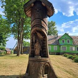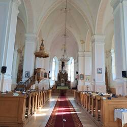 Nach einigen km. Waschbrettstraße, vorbei an riesigen Torfabbaufelden fahren wir in ein Dörfchen rein. Mitten im Friedhof steht eine riesige Kirche, in der hier immer wieder verwendeten Bauweise, eine Mischung aus großen Natursteinen und roten Ziegelsteinen. Auch innen ist es sehr schön. In der zuvor besuchten Käserei mit Schloss und Schlosspark kaufen wir nur etwas traditionellen Käse ein, ohne den Rest zu besichtigen.Read more