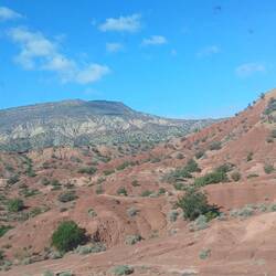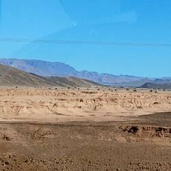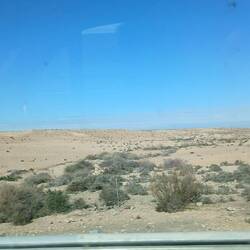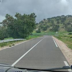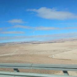 Langsam wechselt das Landschaftsbild von grün und landwirtschaftlicher Nutzung hin zu ocker-braun und trockener Steppenlandschaft mit gelegentlichen plastigbezogenen Gewächshäusern.
