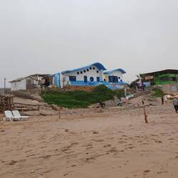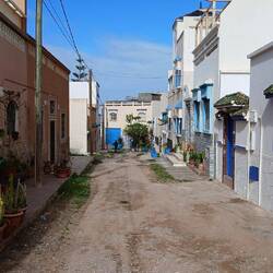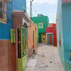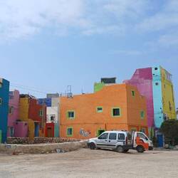 Auf in Richtung Essaouira. Nach nur rund 20 Kilometern Fahrt bogen wir dann von der N 1 ab und erreichten auch schon nach wenigen zig Metern das kleine, aber bekannte "Bunte Dorf", der offizielle Name dürfte Agroud sein. Auch hier, wie an der ganzen Küste, eine Surfschule nach der anderen. Irgendwer muss mal die fixe Idee gehabt haben, die häuser alle irgendwie bunt und jedenfalls alle andersfarbig anzupinseln. So haben wir damit auf unserer Reise neben der blauen und grünen Stadt, jetzt auch das Bunte Dorf erlebt.