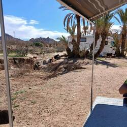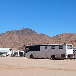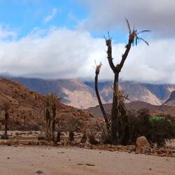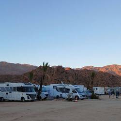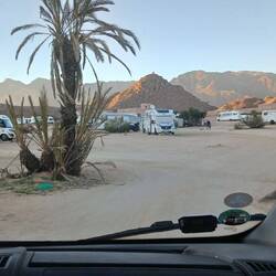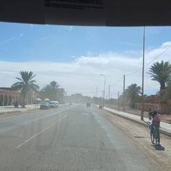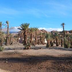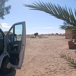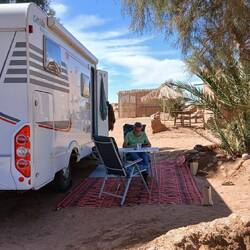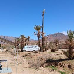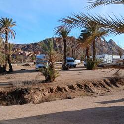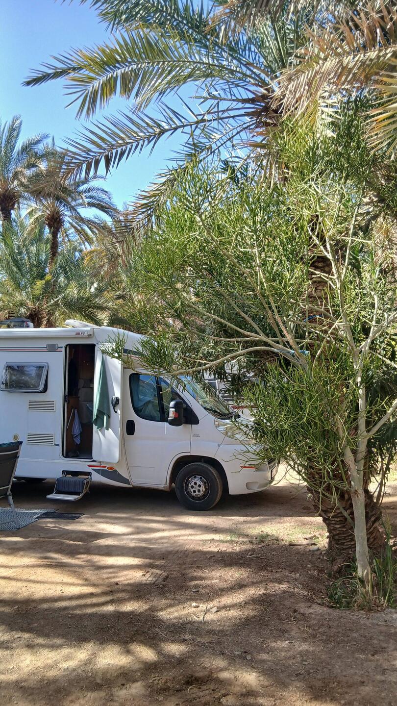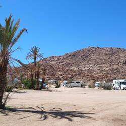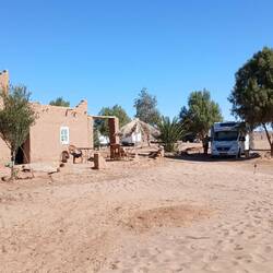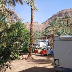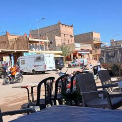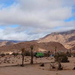 Irgendwie stimmt das mit der Wettervorschau nicht so richtig. Bei etwas Wind sind wir heute Morgen gestartet, unterwegs war es teilweise windig und in Zagora beim Einkaufen noch etwas stärker windig. Das war's dann aber auch für den Rest des Tages. Windig, aber weit weg von Sturm. Wie vorgesehen stehen wir nun auf dem Campingplatz Oasis Palmier und der erste Eindruck ist hervorragend.