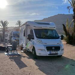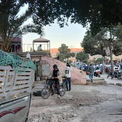 Hier in Aourir haben wir dann noch festgestellt, dass viele Autos, meist älterer Jahrgänge, auf Winkzeichen anhalten und einen mitnehmen. So sind wir dann für 2 Euro heute zum Campingplatz gekommen.