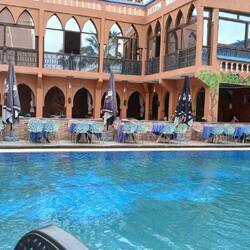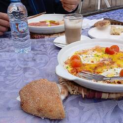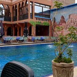 Erst spät am Vormittag machten wir uns auf zu einem Spaziergang nach Tafraoute. Gemütlich schlenderten wir durch die belebte Stadt, nahmen aber diesmal eine andere Richtung aus der Stadtmitte und gelangten so zunächst zu einem Autoschrauber und - lackierer, der die doch abenteuerlichsten Gefährte am Straßenrand stehen hatte und danach zu einem Hotel-Restaurant, dessen tatsächliches Ambiente sich durch einen langen Flur blickend erahnen ließ. Einfach mal rein und schon saßen wir für über eine Stunde in einem gepflegten Hof mit Pool und verspeisten zwei Omelette.