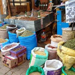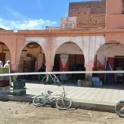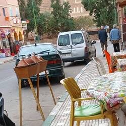 Nach dem Abstellen auf einer riesigen Freifläche und dem Bezahlen von 20 MAD Standgeld liefen wir noch etwas durch das Städtchen und genehmigten uns noch ein marokkanisches Abendmahl zu dem es sogar eine Flasche Wein gab, die allerdings unter dem Tisch ihrer Stellplatz fand. Jetzt ist sie leer.