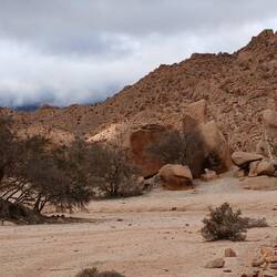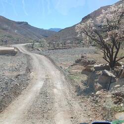 Der heutige Tag führte wie vorgesehen durch den Anti Atlas bis nach Tafraoute. Die meiste Zeit fuhren wir in Höhen von 14 bis 17 hundert Metern. Einige Pässe gingen dann auch locker über 1800 Meter. Außergewöhnlich war heute allerdings nicht nur die phänomenale Umgebung, die Bilder von ständig wechselnden Gesteinsformen und Bergansichten, die trockenen Flussbette mit ihren Oasen, die Palmengärten und insbesondere die tausende von Mandelbäumen mit ihren Blüten von weiß bis zu hellem rosa, die kleinen Bergdörfer mit ihren fröhlich winkenden Einwohnern, Außergewöhnlich war auch die Strecke von etwas vor Imgoun bis Ighrem. Auf einer Strecke von etwa 50 Kilometern mit ständigem Wechsel hin und her über mal schmales und mal breites Wadi. Der Starkregen im Winter hat fast alle Brücken und auch die Betonbahnen über die Flüsse zerstört. Jedes Mal musste der arme Carado von der selbst schon erbarmungswürdigen Straße auf im Flussbett angelegte notdürtige Umfahrungen , auf der einen Seite runter, ins Flussbett, auf der anderen Seite wieder hoch. Das Ganze etwas 20 mal. Die Freude hielt sich in Grenzen, insbesondere als ich zu Fuß erst mal eine längere Strecke abgehen musste, um zu klären, ob es nach den Kurven überhaupt weiter geht.