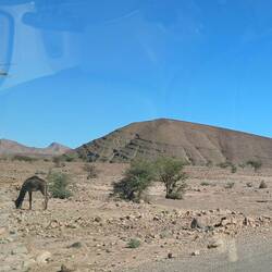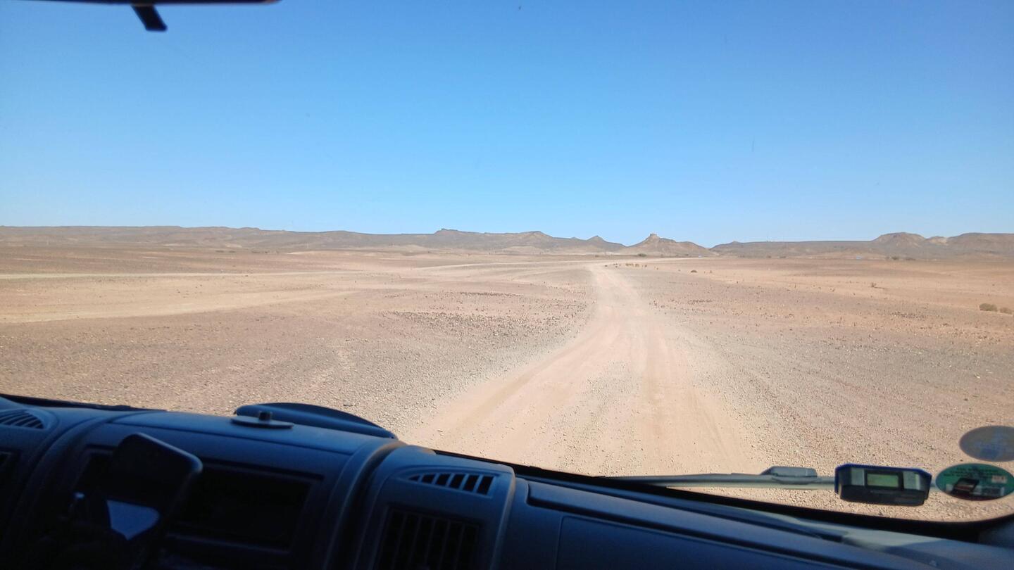 Wie vorgesehen sind wir heute weiter in Richtung Süden los gefahren. In Tissint legten wir die übliche Pause mit zwei Nusnus ein. Wieder fuhren wir fast alleine die rund 130 Kilometer über die gut ausgebaute Landstraße, begleitet von den jetzt nur noch als Hügel sichtbaren Ausläufern des Anti Atlas und mehreren Dromedar- und Schafherden.