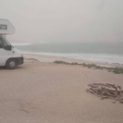 Diese Woche waren wir zunächst bis Mittwoch auf dem Campingplatz in Aourir. Mittwoch Nachmittag wieder zum Stammtisch nach Agadir, zwei Bier getrunken, Adressen bekommen und über Aourir weiter nach Tafraoute, wo wir uns auf einem freien Platz niederließen. Donnerstag durch Tamraght und dann im Womo einen ziemlich heftigen Sandsturm erlebt, der nicht nur das Wohnmobil zum wackeln brachte sondern seine Sandmassen über's Mittelmeer bis nach Deutschland wehte. Am Freitag 13,5 km zu Fuß nach Taghazout. Dieser ganze Küstenabschnitt ist ein einziges Surferparadies, was natürlicherweise zu einem jüngeren Publikum führt, das vornehmlich in Hostels und teilweise abenteuerlichen Gefährten wohnt. Daneben steigt allerdings auch Publikum ab, das sich die Luxusbuden mit 4 Sternen aufwärts und durchschnittlichen übernachtungspreisen von über 200 Euro leisten kann.