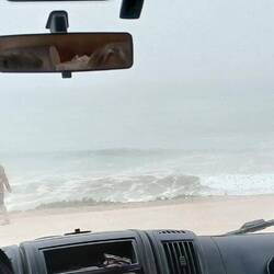 Interessant war für uns die Beobachtung der Brandung, die sich fast täglich anders zeigte und heute Abend fast vollständig in Flugsand gehüllt war.