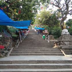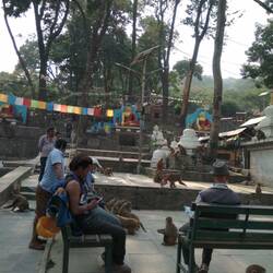 Nachdem Ines dem Vernehmen nach ihr leckerstes Essen seit Anbeginn der Zeit zu sich genommen hatte, machte ich mich auf einen ausgedehnten Stadtspaziergang. Dieser Spaziergang führte mich aus unserem Viertel (Thamel, von Restaurants und Läden geprägt) durch verschiedenste Wohnquartiere bis an den Fuss eines Hügels im Westen der Stadt. Von da aus führten 300 Treppenstufen (alte Bekannte!) zur Swayambhunath Stupa hoch. Von diesem Tempel, im typischen Stil des Himalaya-Buddhismus gebaut, hat man eine tolle Sicht auf das Häusermeer von Kathmandu, jedenfalls soweit es Smog und Staub über der Stadt es zulassen.