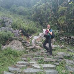 Dieses Routenstück hatte es allerdings in sich: Erst ging es von Landruk 400 Höhenmeter steil durch Reisterrassen runter, bis wir mit zitternden Knien unten im Talboden standen, wo so tropische Luftfeuchtigkeit herrschte, dass uns der Schweiss übers Gesicht strömte. Gemächlich, aber entschlossen machten wir uns an den Aufstieg von 800 Höhenmetern nach Ghandruk. Auf dem Weg erhielten wir moralische Unterstützung von einer Art nepalesischem Sennenhund, der uns treu die ganze Strecke bis nach Ghandruk begleitete. Ines stellte ausserdem einen Sherpa an, der eigens aus der Schweiz eingeflogen worden war...