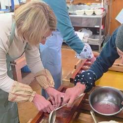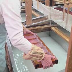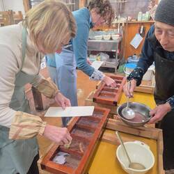 We had choice of making a large sheet of thin washi or a smaller thicker postcard size. Being the practical types, we opted for the postcard size to be easily transported home.