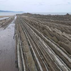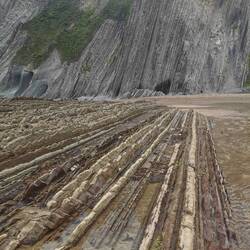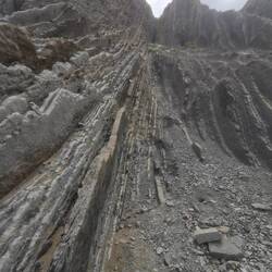 Also es geht um Schichten von Sedimenten die sich am Boden des Meeres gebildet hatten. Durch die Kontinentalverschiebung hatte sich die Iberische Halbinsel an Europa heran geschoben. Dadurch entstanden die Pyrenäen und die obigen genannten Sedimentschichten wurden auch aufgeworfen, so dass sie an dem Ort jetzt fast senkrecht stehen. Jede Schicht steht für einen Zeitraum von z.b. Hunderttausend Jahren, dann hatten dich die Bedingungen wieder geändert und eine weitere Schicht entstand. Und da manche Schichten härter sind als andere entstehen die Formationen.