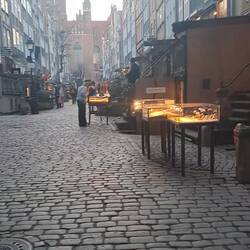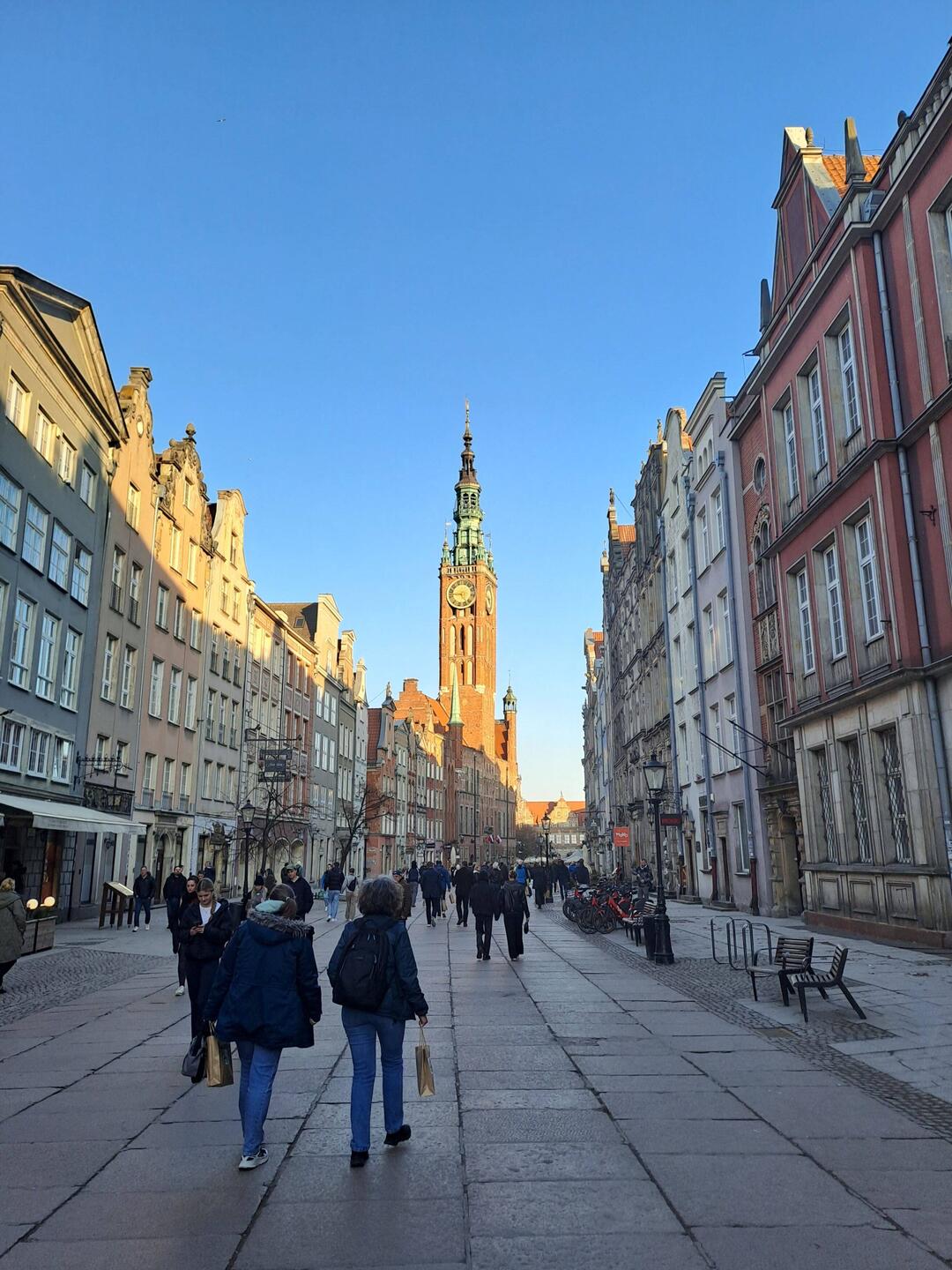 L'immagine ritrae la pittoresca Via Mariacka (Ulica Mariacka) a Danzica, in Polonia, nota per la sua architettura storica e le tradizionali botteghe di ambra.