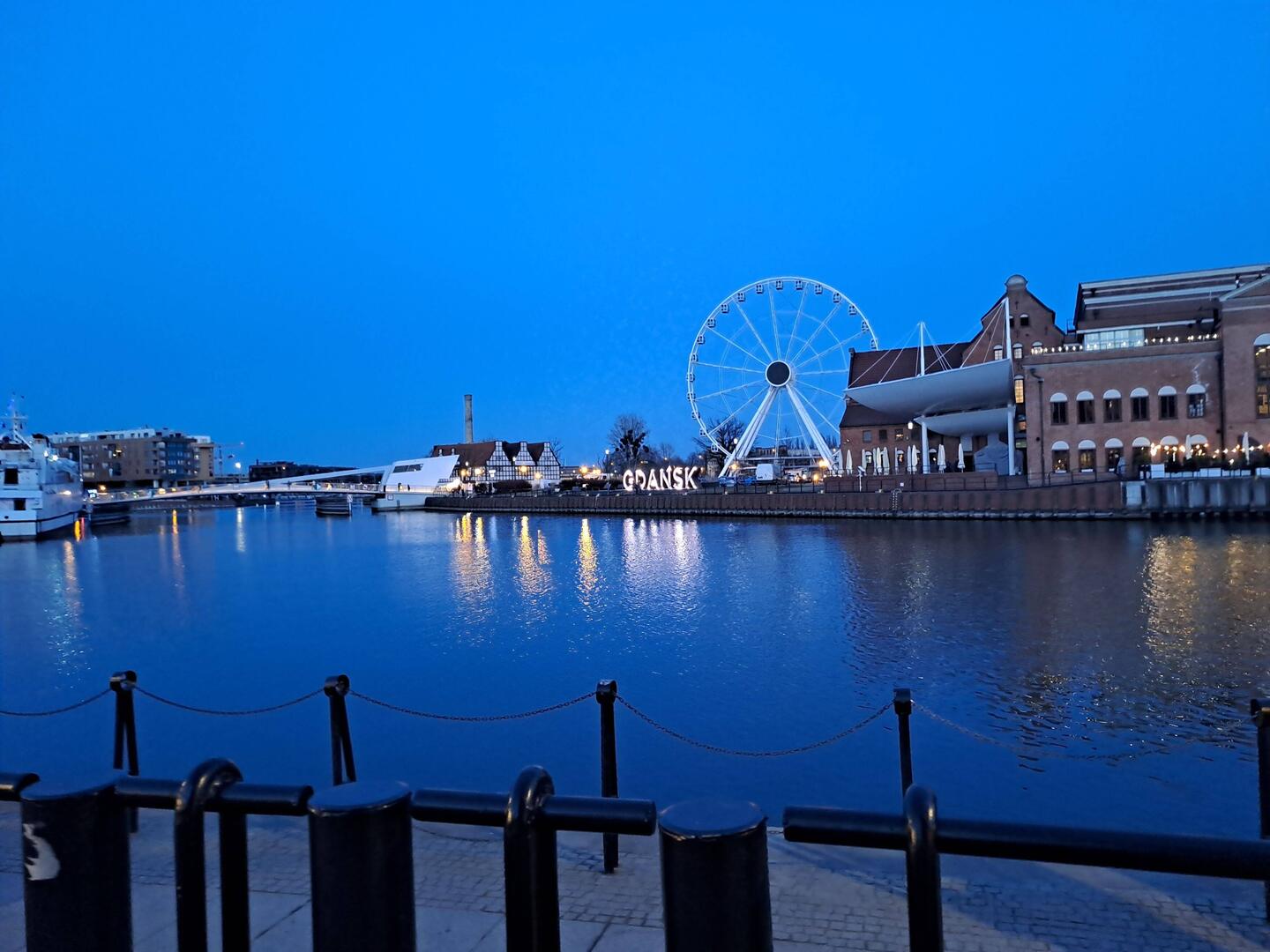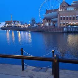 La ruota panoramica AmberSky situata lungo il fiume Motława a Danzica, in Polonia, durante l'ora blu.
