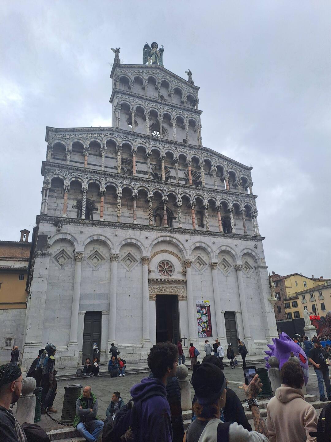 La chiesa è nota per la sua imponente facciata in marmo bianco, caratterizzata da una serie di logge e arcateLæs mere