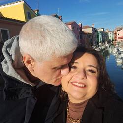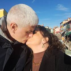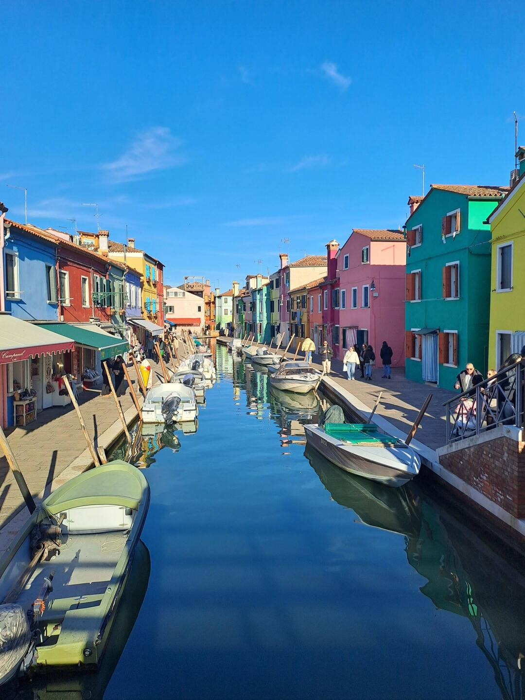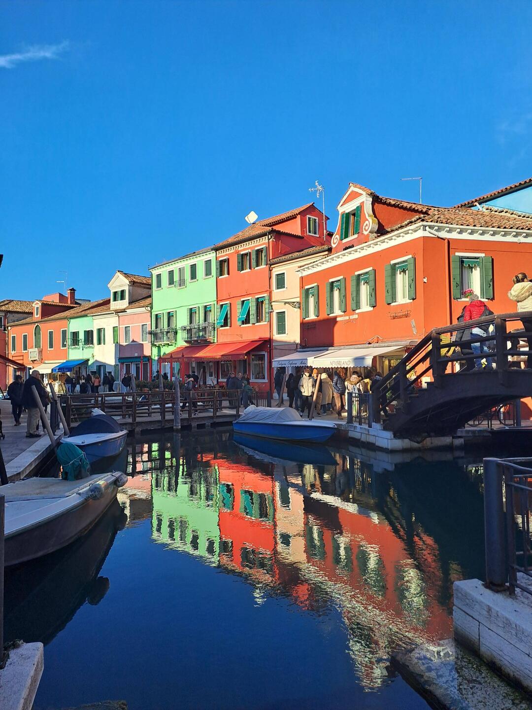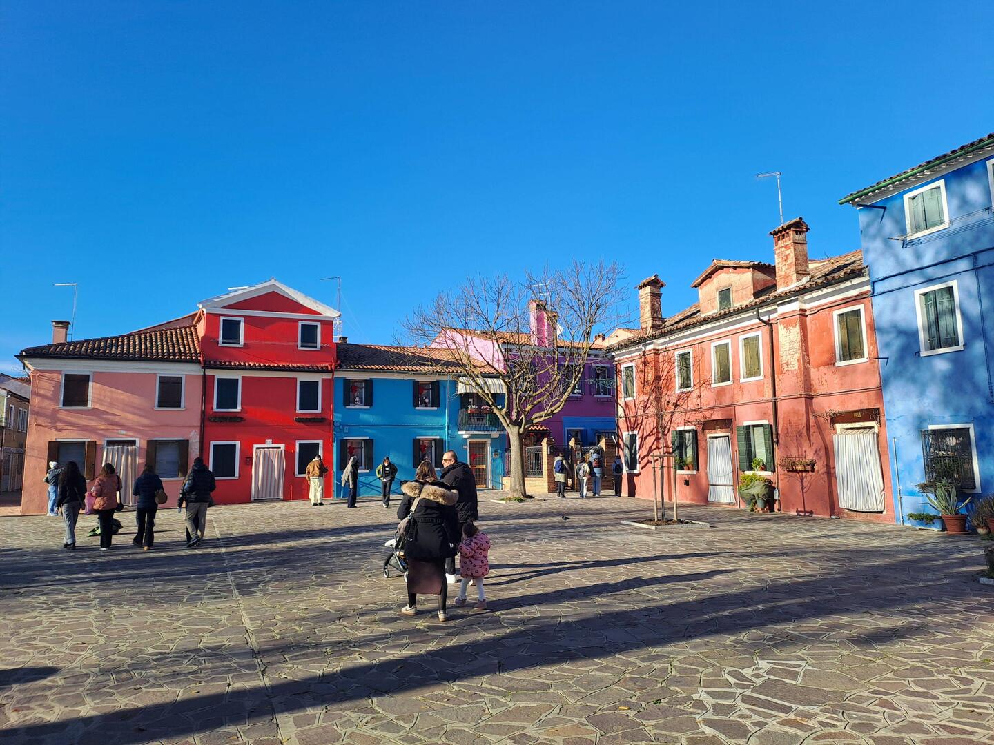 L'immagine mostra un momento sull'isola di Burano, nella laguna di Venezia, famosa per le sue case dai colori vivaci e la tradizione del merletto.