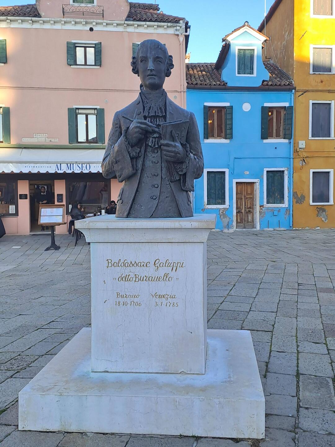 La statua raffigura Baldassarre Galuppi, un noto compositore italiano del XVIII secolo, soprannominato "Il Buranello".