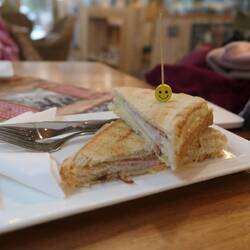 Alina und ich kehren in der Stadt in ein wunderliches "Kaffee-Stübchen", hier gibt es Deko, Pralinen, Bergkäse-Toast und Modeschmuck.