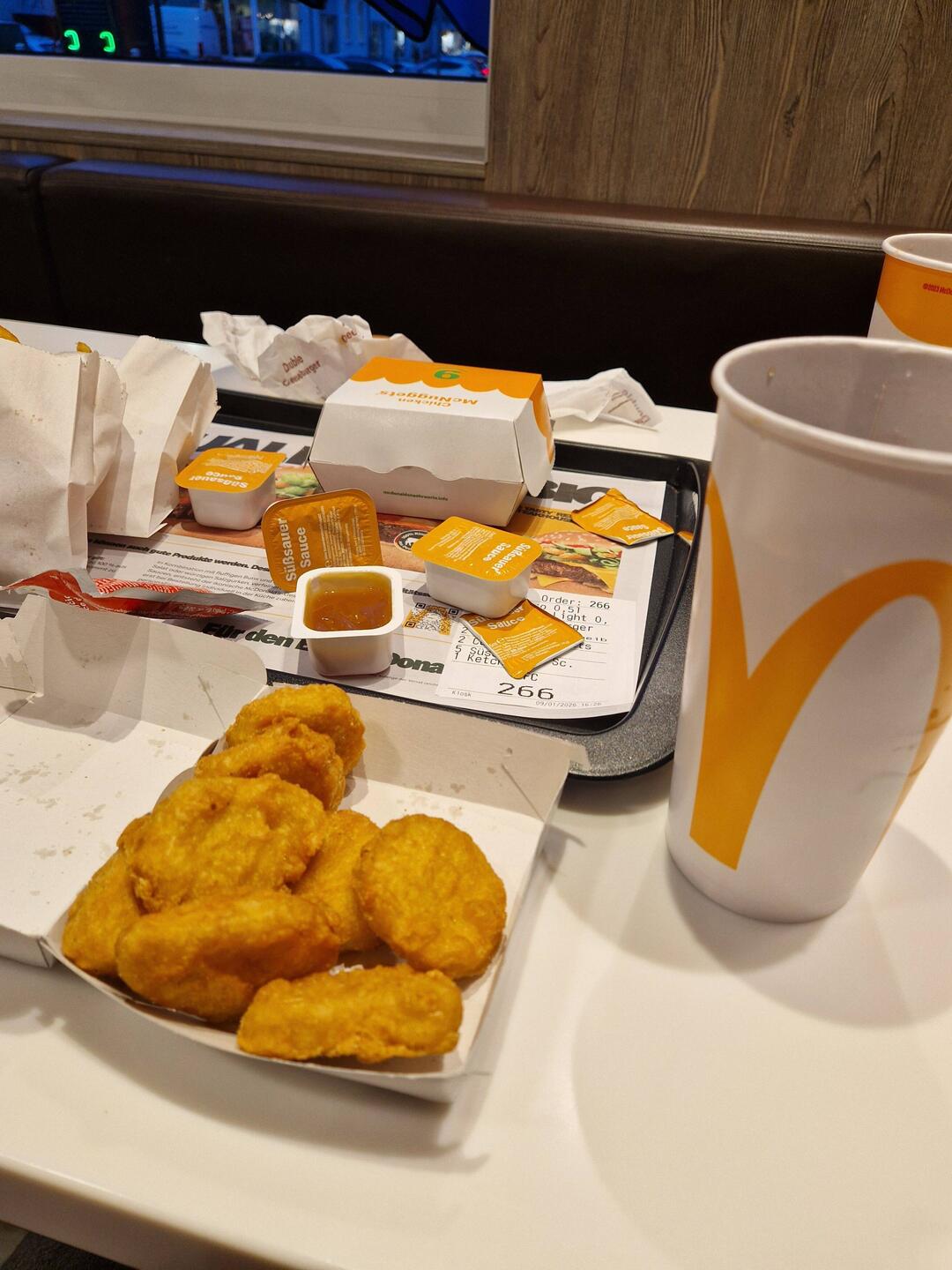 Bei Würzburg fahren wir kurz von der Autobahn ab, für eine Pause bei Mäcces.