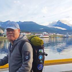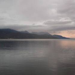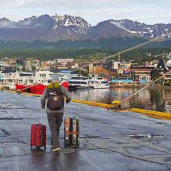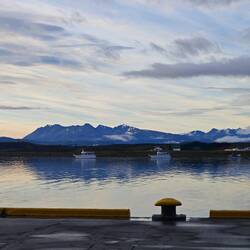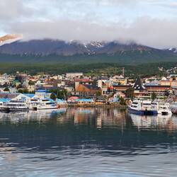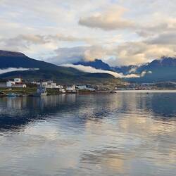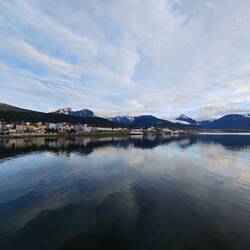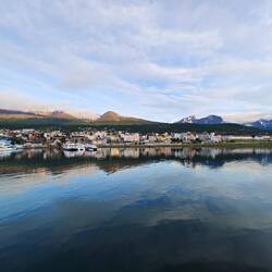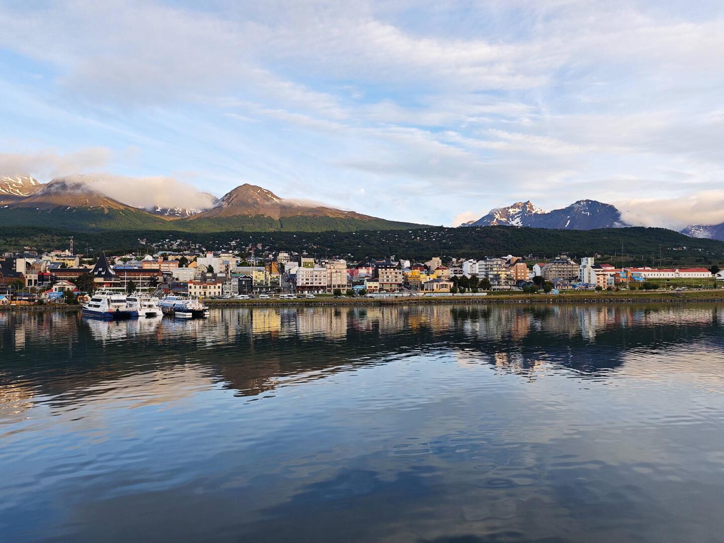 The calm, ripple-free sea at dawn reflected the silhouette of Ushuaia, revealing the tranquil scene of this city at the end of the world.