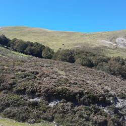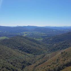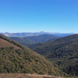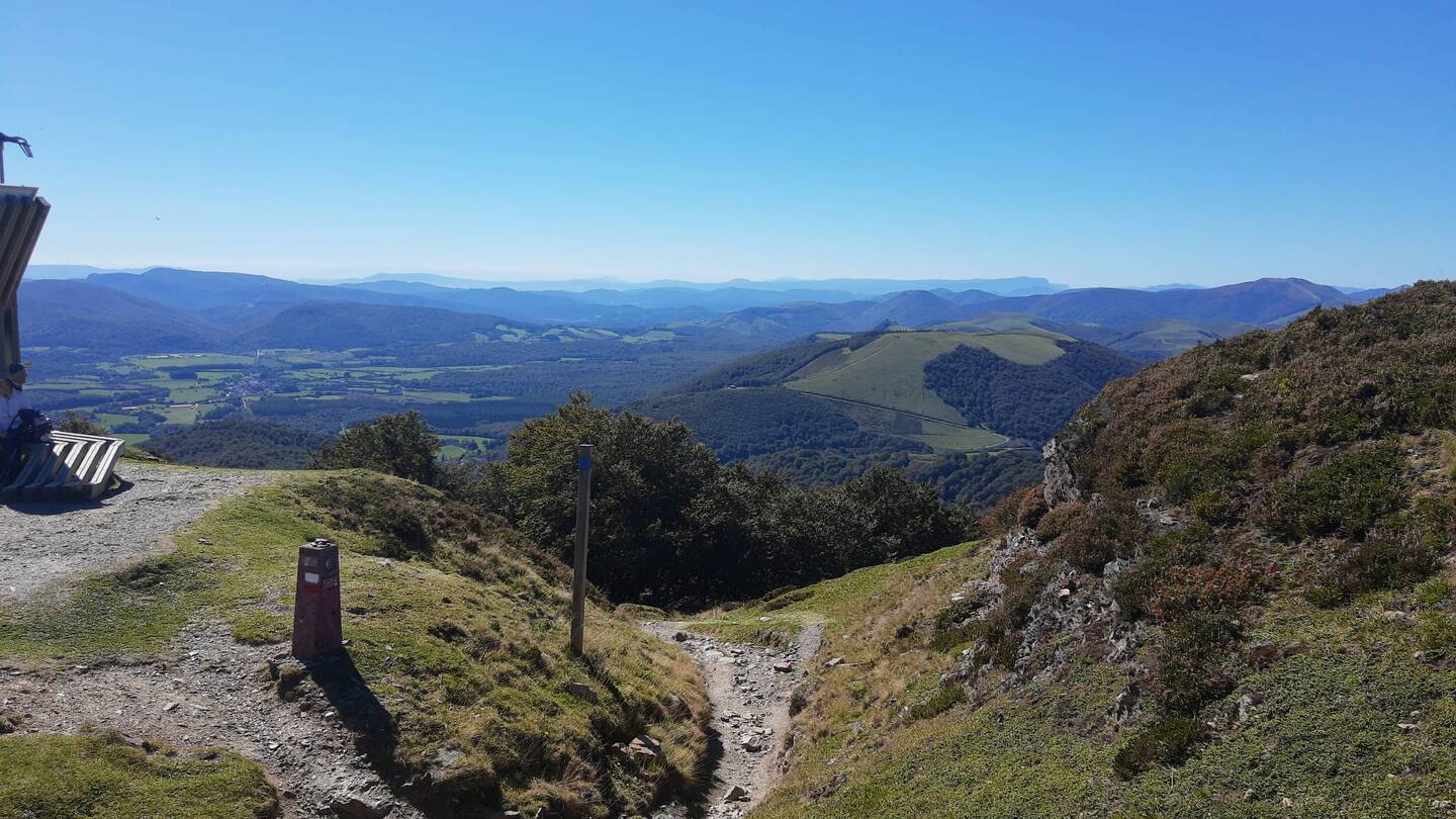 Den höchsten Punkt (1.410m) der Etappe erreichen wir nach 23km. In Richtung Roncesvalles (das man etwas weiter sehen kann) geht es von hier steil durch Wald- und Heidelandschaft bergab.