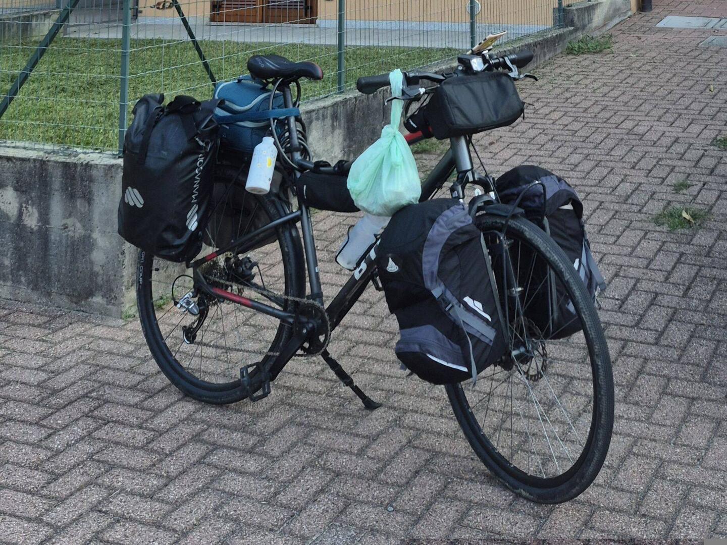 Cuatro alforjas y otras tres pequeñas bolsas de apoyo para llevar a cuestas la casa, la ropa, la comida y todo lo necesario para campar por la naturaleza en unas vacaciones cicloviajeras deRead more