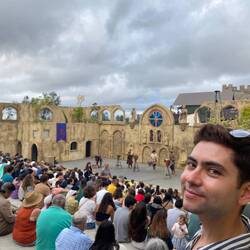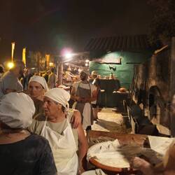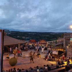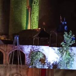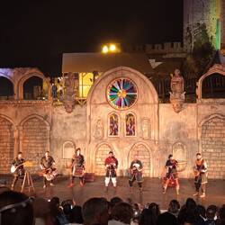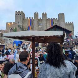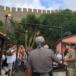Cai a noite enquanto estamos dentro das muralhas do castelo e já tendo visto algum espetáculo num dos palcos que estão montados 🤹