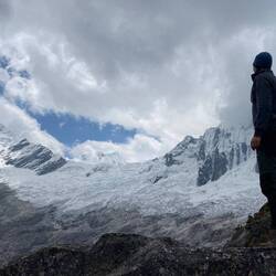 Nach der Buschtoilette ging es los. Der Start war total easy: keine großartigen Steigungen. Die Landschaft war atemberaubend. Wir kamen dem Gletscher XX immer näher. Nach etwa einer halben Stunde ging unser Weg weiter am Fuße des Berges XX bis wir den Ponte Unión Pass erreichten, der uns nach oben führte. Von hier aus lagen 900 Höhenmeter vor uns, denn der Berg ist 4750 Meter hoch. Der Pfad war sehr steinig. Wir gingen ganz entspannt hoch und machten alle 15 Minuten regelmäßig kleine Pausen, um etwas zu trinken. Die dünnere Luft auf dieser Höhe merken wir total. Wir müssen kräftiger atmen und das Herz geht durch die zusätzliche Anstrengung schneller.