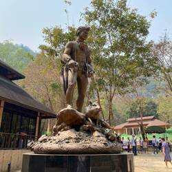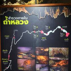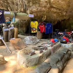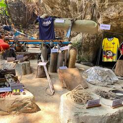 Im Eingang waren einige Gegenstände der Beteiligten ausgestellt, wie z.B. die Fahrräder und Schuhe der Jungs, Tauchermasken. Ach ja eins sei noch gesagt: Alle Jungs überlebten diese Aktion, bis auf ein Soldat der Thai Navy. Er ertrank als Taucher in der Höhle. Ein Denkmal wurde für ihn in der Nähe der Höhle aufgestellt.