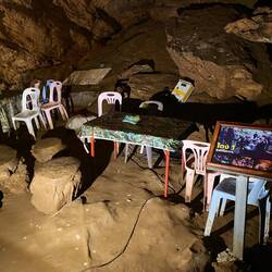 Die Höhle sah exakt wie in den Dokus und Filmen aus. Wir gingen den Weg, den wir so viele Male gesehen haben, nach unten. Allerdings war an diesem, sowie an jedem anderen gewöhnlichen Trockenzeit-Tag kein Wasser in der Höhle weit und breit zu sehen. Wir konnten sogar bis zur ersten Kammer gehen. Hier standen noch exakt die Tische und Stühle, die für Besprechungen genutzt wurden. Mittlerweile sahen die Sitzgelegenheiten durch die Feuchtigkeit etwas mitgenommen aus.