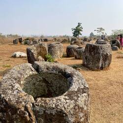 Wir besuchten die größte und wohl berühmteste Stätte: Plain of Jairs 1. Die Stätte wurde während des Vietnamkrieges bzw. des laotischen Bürgerkrieges arg beschossen, sodass einige Steinkrüge zerstört wurden. Auf dem Gelände befinden sich mehrere Bombenkrater. Und noch heute liegen unzählige Blindgänger in den Stätten. Nur die Stätte 1,2 und 3 sind für Besucher zugänglich und wurden weitestgehend gesichert.