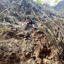 Im Klettern gibt es verschiedene Skalen für die Schwierigkeit. Diese sind auch Länderabhängig. In Laos wird die französische Skala benutzt. Diese beginnt von Stufe 1 bis Stufe 10. Wobei es auch noch Zwischenbereiche gibt die in Buchstaben oder mit „+“ ausgedrückt werden. Z.B. 5a, 5b, 5c oder 6a+. C ist das Schwierigste in der Stufe. 9-10 kann man sich vorstellen, als wenn man eine Rausfasertapete beklettern will gefühlt 😂.