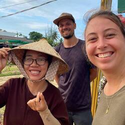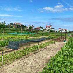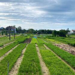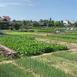 Heute Vormittag haben wir uns erst einmal mit der Planung der nächsten Tage für Vietnam beschäftigt, bevor es mit dem Rad zum Tra Que Garden Village ging. Das Dorf befindet sich auf einer kleinen Insel, nicht weit vom Strand entfernt. Das Besondere an diesem Dorf ist, dass es in der Mitte ein riesiges Ackerfeld zum Anbau unterschiedlichster Gemüse- und Kräutersorten hat. Ringsherum sind einige Restaurants und Kochschulen angesiedelt. Das scheint auf dem ersten Blick ziemlich touristisch zu wirken, aber der Garten besteht schon seit über 200 Jahren. Wir hatten vorher die Vermutung, dass es ein „Fake-Dorf“ ist und nur für den Tourismus erbaut wurde. Aber dem ist nicht so. Die Farmer arbeiten schon seit Generationen auf diesen Feldern. Noch heute kann man den Farmern bei ihrer Arbeit beobachten (oder selbst Hand anlegen).