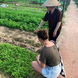 Wir gingen weiter und sahen ein Restaurant, bei dem zwei Frauen standen. Sie riefen uns etwas zu, wir konnten aber nicht verstehen was. Also gingen wir einfach mal dorthin. Eine von ihnen fragte uns, ob wir was essen wollen, wir lehnten dankend ab, da wir ja schon vorher etwas gegessen haben. Wir unterhielten uns eine Weile. Die Frauen sind Schwestern. Die gesamte Familie arbeitet hier im Village: Ihre Eltern auf dem Feld und die Geschwister sowie Cousinen helfen beim Restaurant mit. Sie erzählten uns ein wenig vom Feld. Sie gaben uns einen Flyer mit für eine Kochstunde in ihrem Restaurant. Da wir jedoch die nächsten Tage schon verplant waren und Montag, Dienstag arbeiten mussten, werden wir das wohl nicht schaffen. Nach einer Weile verabschiedeten wir uns und gingen wir weiter über das Feld. Erschreckend wie wenig wir von dem Gemüse und den Kräutern, die hier angebaut werden, wussten. Die Kräuter rochen so frisch, als wir mit den Händen drüber gingen. (Das war ein Tipp von den beiden Frauen) Mir kam auf einmal so ein Gedanke: Warum nicht einfach umdrehen und fragen, ob sie Zeit haben eine kleine Tour über das Feld zu machen. Sie schienen sich hier sehr gut auszukennen und wir wollten mehr über das Dorf und die Menschen erfahren. Wir gingen zurück und tatsächlich hatte Lieu, einer der Frauen, gerade wirklich Zeit, um eine Führung zu machen! Wir waren begeistert. Und Lieu auch.