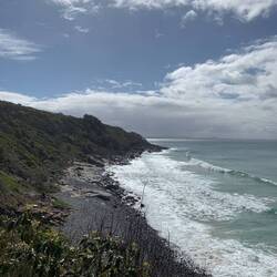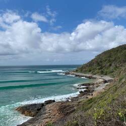 Ein Wanderweg ging direkt durch den Wald bis hin zur Küste. Uns kamen kaum andere Leute entgegen, obwohl der Weg mitten durch den Wald total schön war. Der Regenwald erinnerte uns ein wenig an den Regenwald in Peru. Die Bäume waren dicht, hoch und ihre Blätter so schön grün. In dem Nationalpark soll es wohl auch Koalas geben - laut Google Bewertung von vor 2 Jahren… Mal schauen, ob wir heute Glück haben und einen Koala sehen. An der Küste angekommen gingen wir zu einem Viewpoint und bestaunten den Blick auf das weite Meer. Wir hatten sogar Glück und sahen Delfine. 🐬 Wir gingen an der Küste entlang und sahen immer wieder Delfine. Einmal sogar, wie sie auf den Wellen “ritten”. Das sah nach einer Menge Spaß aus. 😆