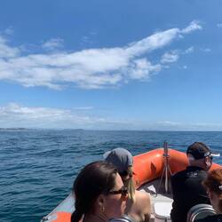 Wir kamen um Punkt 9 Uhr am Treffpunkt in der Nähe der Goldcoast an. Wir bekamen unser Equipment zum Schwimmen, wie einen Neoprenanzug (ja es ist noch immer ziemlich kalt im Wasser) und Flossen. Wir bekamen eine Einführung vom Personal und dann saßen wir alle endlich im Boot. Das Boot war nicht sonderlich groß, aber reichte vom Platz her für uns vollkommen aus. Die Bootsfahrt war recht abenteuerlich. Wir fuhren erst einmal raus in das offene Meer. Hierfür durchfuhren wir erst einmal einen Nebenfluss zum Meer. Auf offener See wurde das Wasser direkt rauer, die Wellen größer.