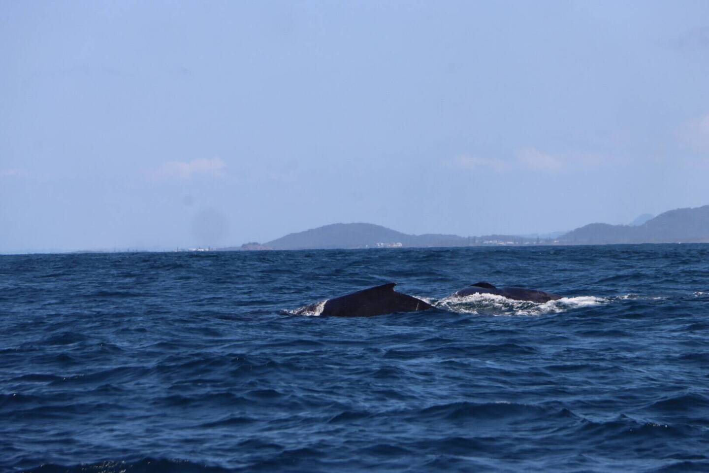 Es dauerte nicht lange und schon sahen wir unseren Wale: eine Mama mit ihrem Baby! 🐋Langsam näherten wir uns den beiden an. Wir bestaunten diese wundersamen Geschöpfe. Abwechselnd kamen sie an die Oberfläche und schwammen wieder nach unten. Es war ein toller Moment, den Tieren so nah zu sein. Bislang haben wir die Wale ja nur aus der Entfernung vom Strand aus gesehen. Doch nun hier im Wasser mit ihnen zu sein, war noch einmal etwas ganz anderes.