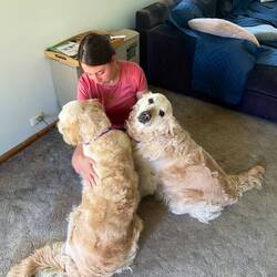 Pumpkin (die Dicke, 14 Jahre), Hemphrey (Pudelmix, 6 Jahre, braun) und sein Bruder Walter (Pudelmix, 6 Jahre Vanille/Braun)