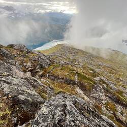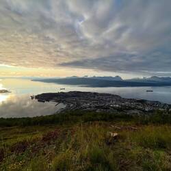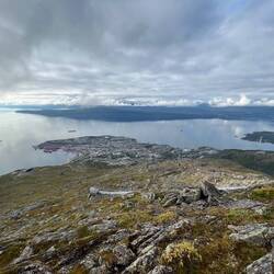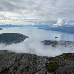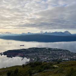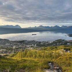 Der Linken ist der Hausberg Narviks, der vom Fjord/Meeresspiegel einen Kilometer und 3 Meter in den Himmel ragt. Es gibt auch eine Seilbahn bis 650m Höhe, aber wir entscheiden uns für denLeggi altro