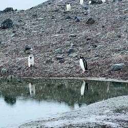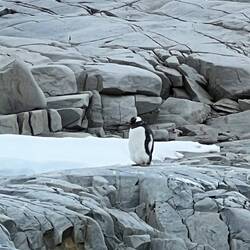 Gentoo Penguin rookery, with 1 Chinstrap hanging out. (Our Expedition Leader Isa, named him Pedro)