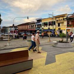 La journée commence avec la montée pour sortir du village, certaines sections sont toutes boueuses… nos vélos, sacoches et souliers tout propres, bien astiqués à Pijao redeviennent très rapidement sales! La montée se poursuit jusqu’au village de Buenavista, de l’autre côté du sommet, où nous avions fait une initiation de parapente quelques jours auparavant. Après Buenavista, c’est la descente jusque dans la vallée, un plaisir bien mérité après avoir monté depuis le matin. Nous retrouvons Mélissa pour le lunch, à Caicedonia, pour un dernier au revoir! Après quelques km de plat, on remonte de manière assez raide vers Sevilla, pour une montée de 530m sur 8km, assez essoufflante, surtout après deux semaines de pause. A mi-chemin, nous sommes surpris par une bonne averse. Nous nous abritons avec deux jeunes hommes en moto, qui étaient étonnés et fatigués juste de penser à notre voyage!