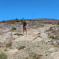 First walking day; warm weather, very green, hopping stones across creeks, mountains with snow in the distance. Olivia has great stamina and has become a very good navigator.