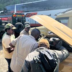 Sind jetzt 5 Stunden unterwegs, mit toller Aussicht und einem kleinen Malheur, einer der Benzinschläuche hat sich gelöst. Aber fünf Mann haben das schnell fixen können. Sehr spannend. 🤣