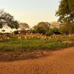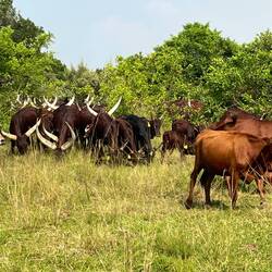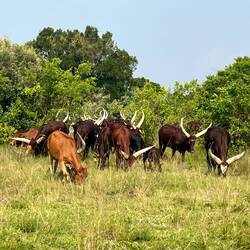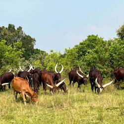 Aus der Rückfahrt nochmals durch eine Herde Uganda Kühe gefahren. Sehr beeindruckend was die für Hörner auf den Kopf tragen.