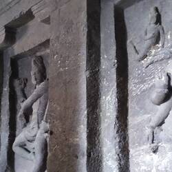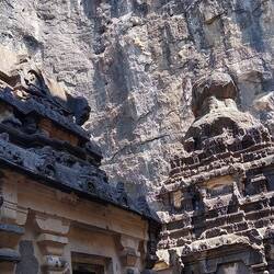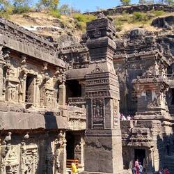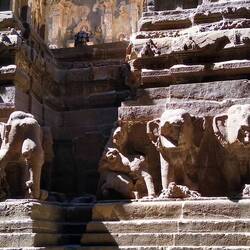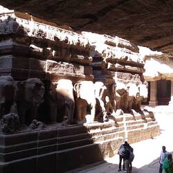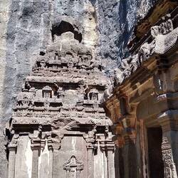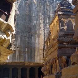 In Ellora sind die Tempel komplett aus dem Stein heraus gehauen. Gleich der erste, Nummer 16 ist sehr groß und eindrucksvoll.